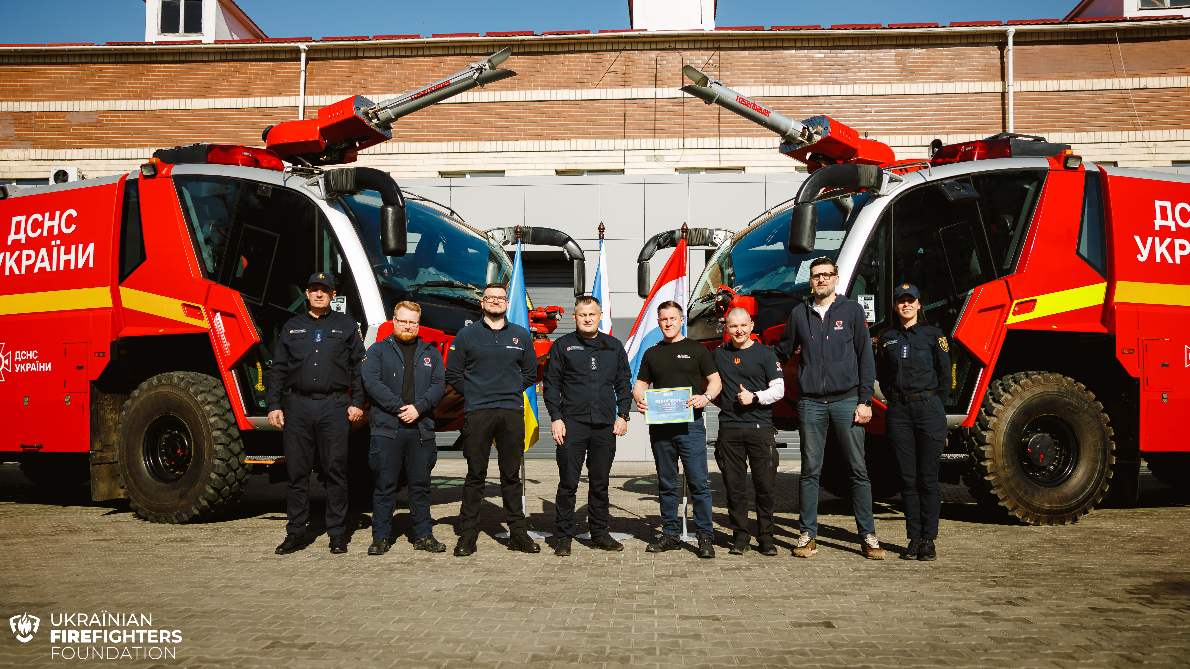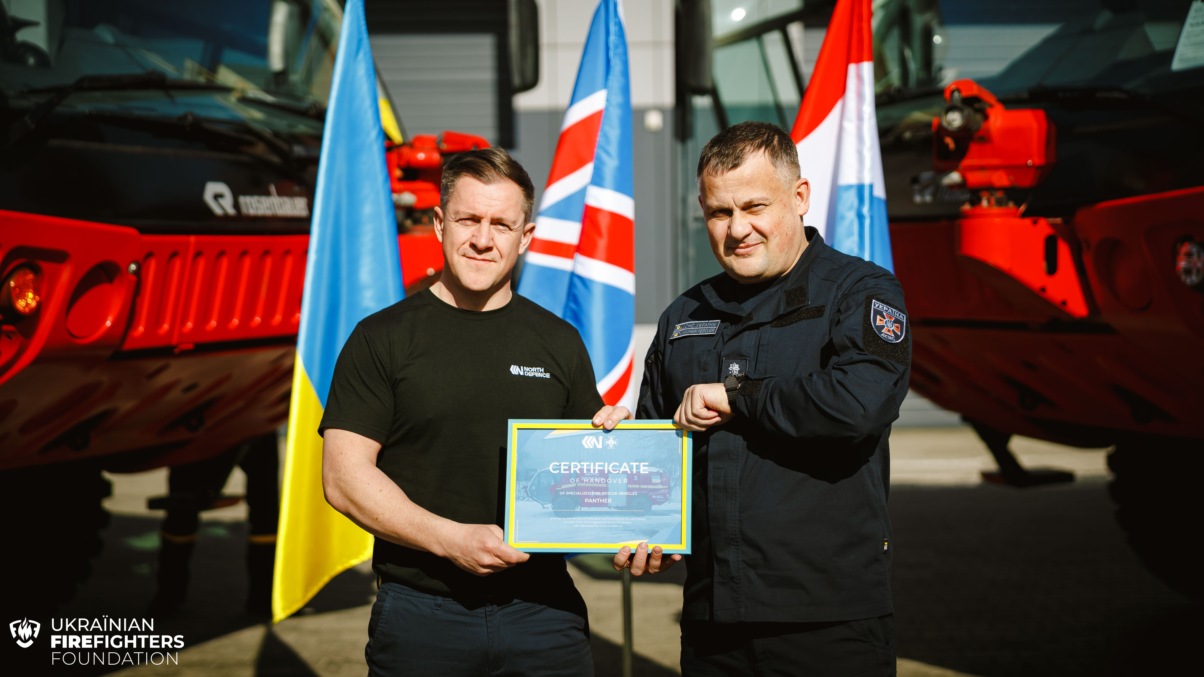 The Ukrainian FireFighters Foundation, together with its partners, has handed over two modern, highly efficient PANTHER 4×4 airport fire trucks to units of the State Emergency Service of Ukraine. This delivery was the result of consolidated efforts by our foundation, North Defence, and the Ministry of Defence of Luxembourg.
